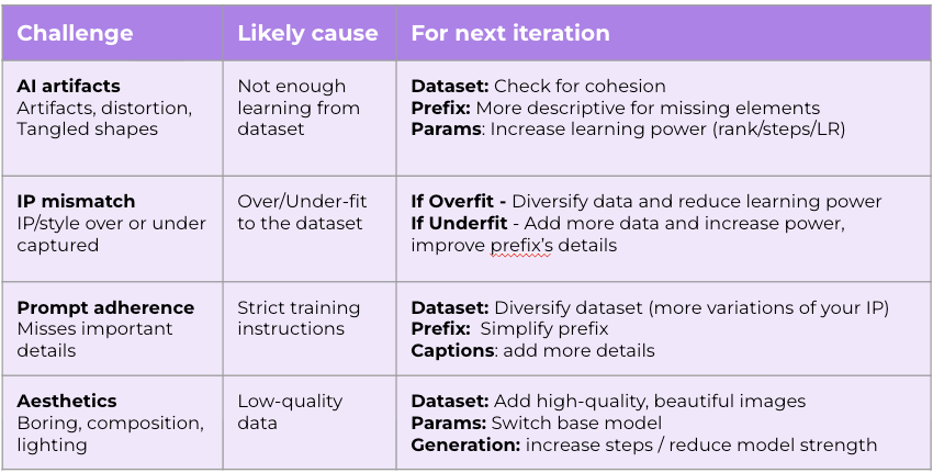 After 3 iterations without meaningful improvement: Something fundamental is wrong. If fine-tuning is indeed the right approach for your goals, the dataset is the most likely culprit. Go back to Step 2 and critically re-evaluate your training images - cohesion, diversity, and quality.